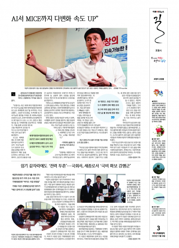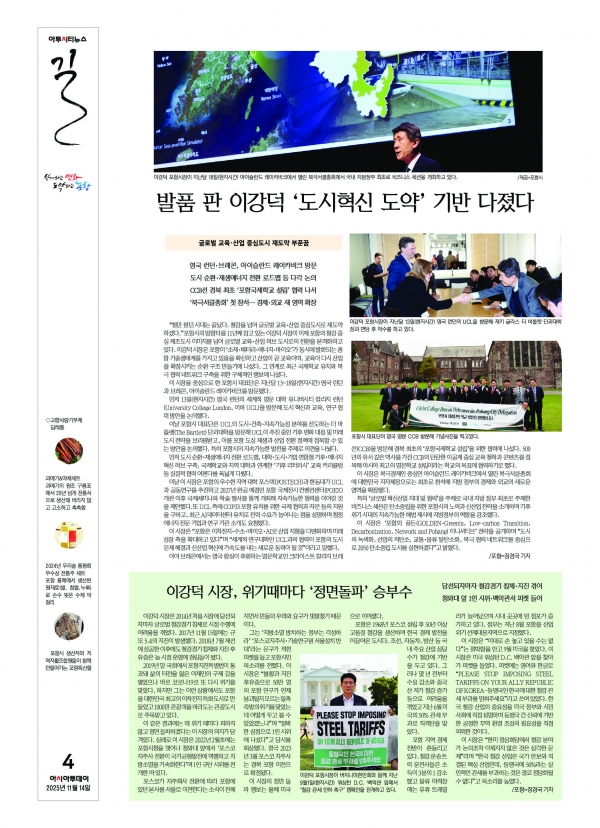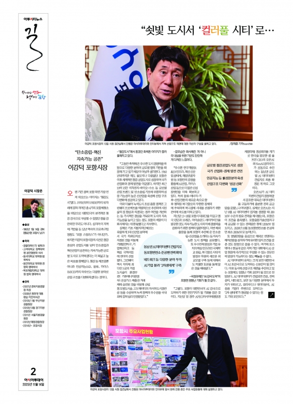 "철강을 넘어 신산업을 육성하며 새로운 100년을 준비하고 있다." 이강덕 시장이 꿈꾸는 포항의 미래는 인공지능(AI), 바이오, 물류, 마이스(MICE) 등 거의 모든 신산업 분야에서 만만찮은 경쟁력을 갖춘 글로벌 혁신 거점도시다. 포항시장으로 재직했던 지난 11년 동안의 성과를 바탕으로 이제 더 높은 곳을 바라보는 그의 포부를 들어본다.