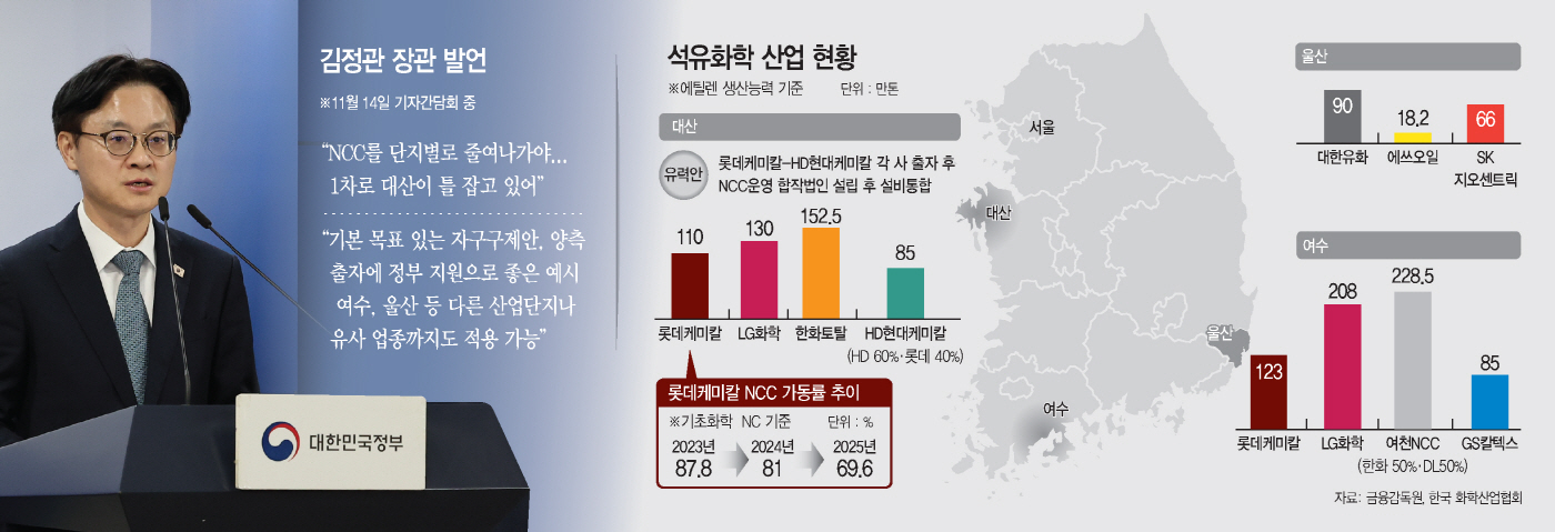 연말을 기한으로 추진되는 석유화학산업 구조조정이 충남 대산산업단지를 시작으로 본격화될 전망이다. 신호탄이 될 롯데케미칼과 HD현대케미칼 간 설비 통합안 제출이 임박했다. 양사는 각자 출자를 통해 NCC 통합 법인을 출범시키는 방식으로 큰 틀은 잡아뒀고, 이르면 이달 말 세부 조정을 거친 자력구제안이 최종 제출될 가능성이 제기된다. 트럼프 관세 폭탄을 막아내는 데 총력전을 벌인 정부가 이제 국내로 시선을 돌렸고, 석유화학과 철강산업에 대한 대규모 재편에 드라이브가 걸린 상황이다. 김정관 산업통상부 장관은 대산산업단지에서 도출된 자력구..