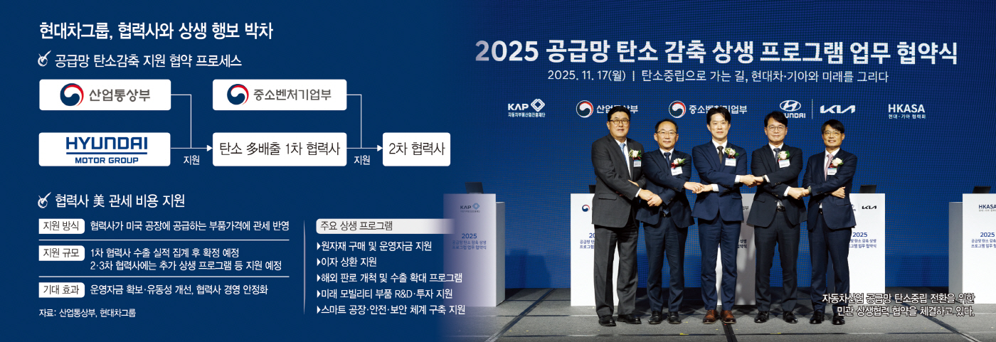 미래차를 위해 필요한 기술과 첨예한 관세정책 등 급변하는 글로벌 환경에 맞춰 현대차그룹이 국내 자동차산업 생태계를 진두지휘 중이다. 높아가는 환경규제에 맞춰 협력사들의 탄소 감축 지원을 현대차가 이끌고, 미국 관세 부담으로 어려움을 겪는 협력사들의 비용도 전액 감당키로 하는 등 변화의 무거운 파고를 함께 뚫고 있어 주목 된다. 17일 현대차·기아, 산업통상부에 따르면 현대차와 기아는 산업부와 손을 잡고 협력사의 중장기 탄소감축 계획 수립 지원, 설비 도입과 역량강화를 위한 '탄소 저감 상생 프로그램'을 내년부터 운영할 예정이다. 현..