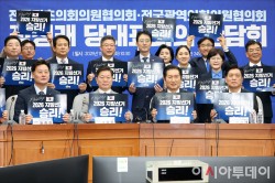 정청래 더불어민주당 대표와 참석자들이 18일 국회에서 열린 당대표-전국기초·광역의회의원협의회 간담회에서 구호를 외치고 있다.