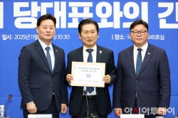 정청래 더불어민주당 대표(가운데)가 18일 국회에서 열린 당대표-전국기초·광역의회의원협의회 간담회에서 최종현 광역의회의원협의회 대표와 박열완 기초의회의원협의회 대표에게 건의서를 전달받고 있다.