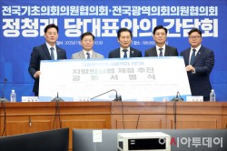 정청래 더불어민주당 대표가 18일 국회에서 열린 당대표-전국기초·광역의회의원협의회 간담회에서 지방의회법 제정 추진 공동서명서에 서명한 뒤 기념촬영을 하고 있다. 사진 왼쪽부터 최종현 광역의회의원협의회 대표, 박승원 참좋은지방정부위원장, 정청래 대표, 조승래 사무총장, 박열완 기초의회의원협의회 대표.