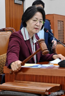 6일 국회에서 열린 법제사법위원회 전체회의에서 추미애 위원장이 의사봉을 두드리고 있다.