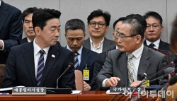 강훈식 대통령비서실장(왼쪽)과 위성락 국가안보실장이 6일 국회 운영위원회에서 열린 대통령비서실·국가안보실·대통령경호처 등에 대한 국정감사에서 이야기를 나누고 있다.
