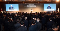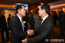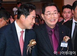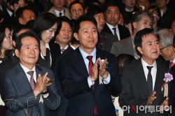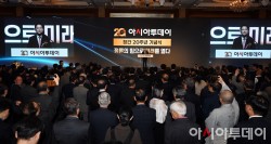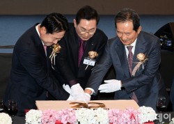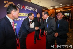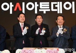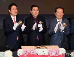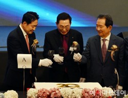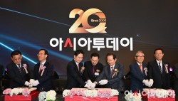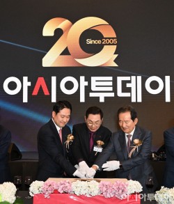 글로벌 종합일간지 아시아투데이가 창간 20주년을 맞이한 10일 서울 중구 소공동 롯데호텔 그랜드볼룸에서 열린 창간 20주년 기념행사에서 우종순 아시아투데이 회장(가운데)과 장동혁 국민의힘 대표, 정세균 전 국회의장이 축하 떡케이크 커팅을 하고 있다. (사진 오른쪽부터) 우상호 대통령실 정무수석, 손병두 CNBCKOREA 회장, 정세균 전 국회의장, 우종순 회장, 장동혁 국민의힘 대표, 주호영 국회부의장, 박종현 한국기자협회장. /정재훈 기자
