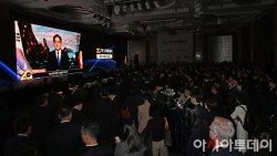 글로벌 종합일간지 아시아투데이가 창간 20주년을 맞이한 가운데 10일 서울 중구 소공동 롯데호텔 크리스탈볼룸에서 열린 아시아투데이 창간 20주년 기념식에서 우원식 국회의장이 영상축사를 하고 있다.