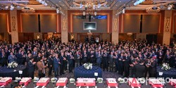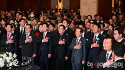 글로벌 종합일간지 아시아투데이가 창간 20주년을 맞이한 가운데 10일 서울 중구 소공동 롯데호텔 크리스탈볼룸에서 열린 아시아투데이 창간 20주년 기념식에 참석한 우종순 아시아투데이 회장과 장동혁 국민의힘 대표, 정세균 전 국회의장, 오세훈 서울시장을 비롯한 각계 인사들이 국기에 대한 경례를 하고 있다.