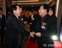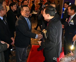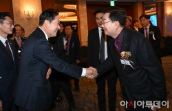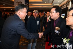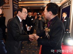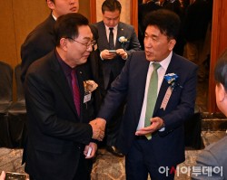 글로벌 종합일간지 아시아투데이가 창간 20주년을 맞이한 가운데 10일 서울 중구 소공동 롯데호텔 크리스탈볼룸에서 열린 아시아투데이 창간 20주년 기념식에서 우종순 아시아투데이 회장이 김기문 중소기업중앙회 회장과 인사하고 있다.