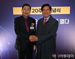 글로벌 종합일간지 아시아투데이가 창간 20주년을 맞이한 가운데 10일 서울 중구 소공동 롯데호텔 크리스탈볼룸에서 열린 아시아투데이 창간 20주년 기념식에서 우종순 아시아투데이 회장이 최승재 중소벤처기업부 중소기업 옴부즈만과 인사하고 있다.