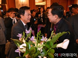 글로벌 종합일간지 아시아투데이가 창간 20주년을 맞이한 가운데 10일 서울 중구 소공동 롯데호텔 크리스탈볼룸에서 열린 아시아투데이 창간 20주년 기념식에서 우종순 아시아투데이 회장이 김태흠 충남지사와 인사하고 있다.