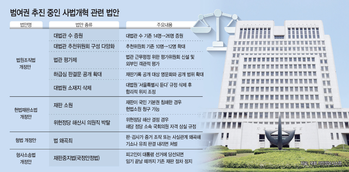 우선 범여권은 법원조직법 개정을 통해 대법관 증원(14명→26명), 대법관 추천위원회 구성 다양화, 법관 평가제, 하급심 판결문 공개 확대 등 추진하고 있다. 그러나 해당 법안들은 사법부의 독립성 약화로 이어질 수 있는 조항을 다수 포함하고 있다는 비판이 제기되고 있다.