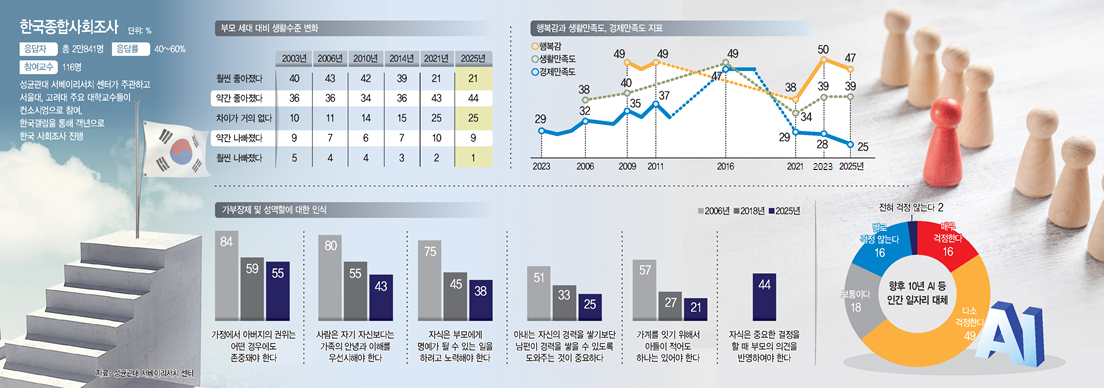 지난 20년간 한국 사회는 급격한 경제 성장의 여파 속에서 깊고 복잡한 변혁을 겪었다. 유교적 가족질서와 권위 중심의 사회에서 벗어나려는 흐름은 점차 강해졌고, 개인의 정체성이 전면으로 부상했다. 동시에 '개천에서 용 나는 시대는 끝났다'는 현실적 인식이 확산되며 사회 이동성에 대한 비관론이 자리 잡았다. 그러나 역설적으로 이러한 냉정한 시대 인식 속에서도 행복감과 생활의 만족도는 일정 수준을 유지하는 흐름을 보였다. 인공지능(AI)과 자동화 기술의 급격한 발전은 인간의 삶과 노동의 의미에 근본적인 질문을 던지며, 사회 전반에 또 한 번의 인식 재편을 불러오고 있다.