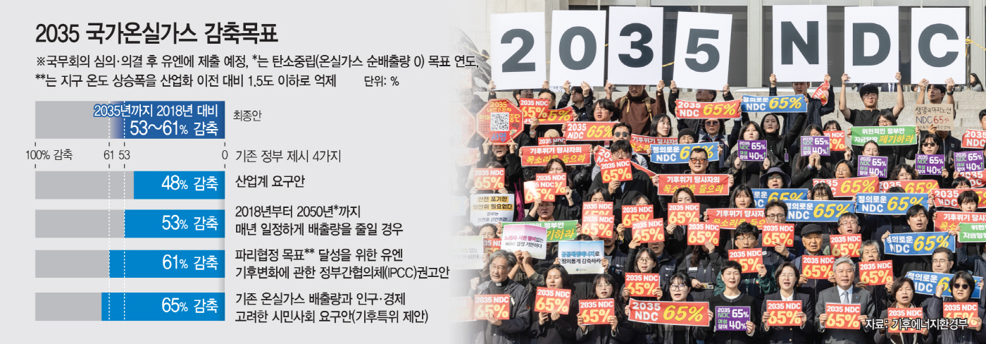 대통령 직속 탄소중립녹색성장위원회는 10일 김민석 국무총리 주재로 정부 서울청사 별관에서 전체회의를 열고 2018년 대비 53∼61%의 2035년 온실가스 감축 목표를 설정하기로 의결했다. 김 총리는 "전문가, 시민사회, 국회 등 각계 의견을 수렴해 53%를 최소, 61%를 최대로 하는 감축안을 마련했다"며 "우리 정부의 탈탄소 전환을 가속화하고 산업의 경쟁력을 끌어올리기 위한 결정"이라고 설명했다.