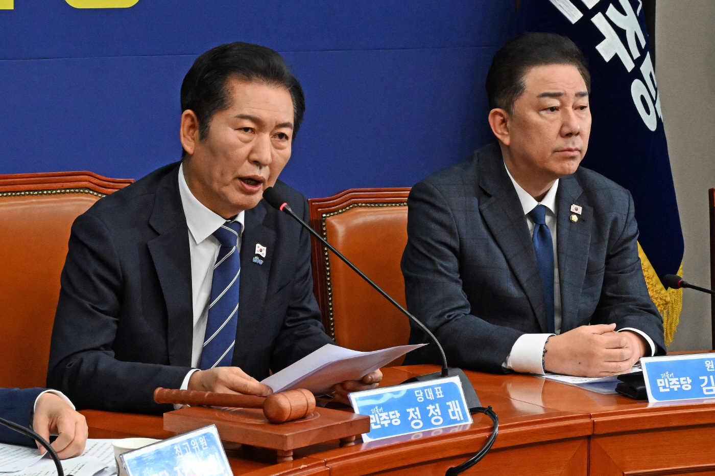 | | 정청래 더불어민주당 대표가 12일 국회에서 열린 최고위원회의에서 발언을 하고 있다. 오른쪽은 김병기 원내대표. /송의주 기자 songuijoo@ |