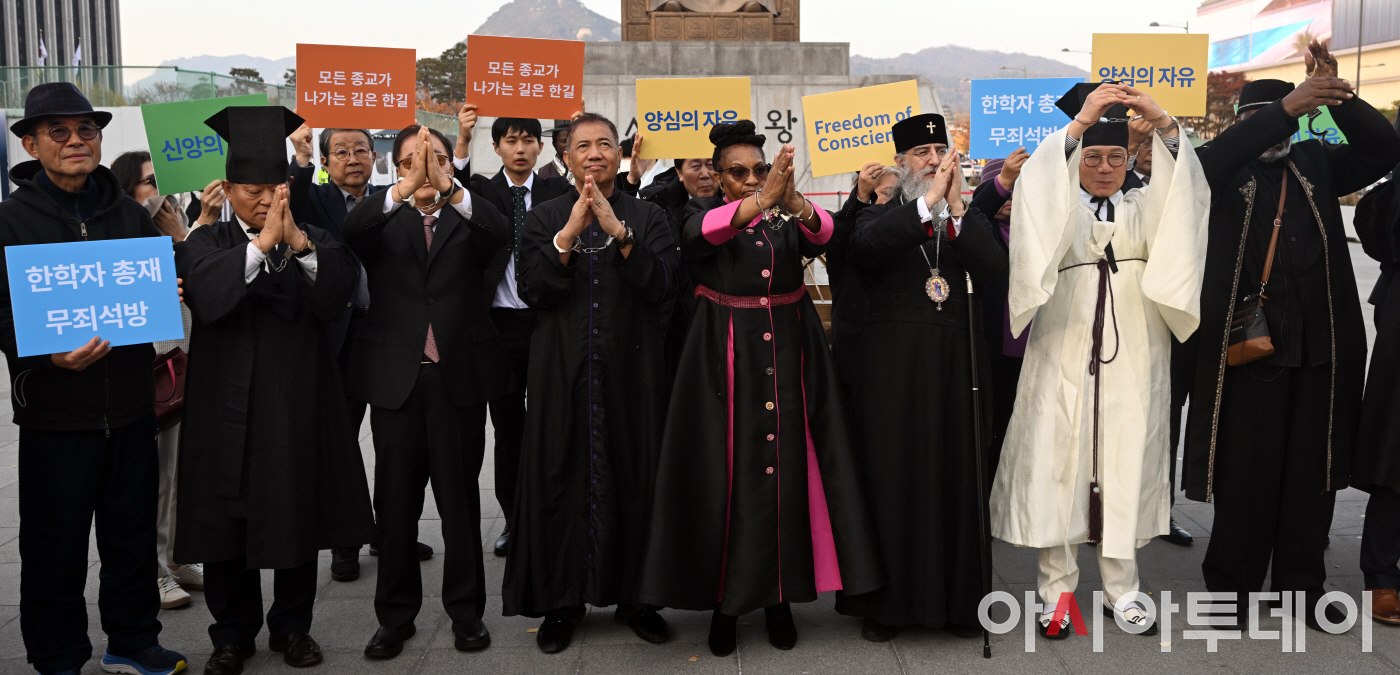세계 종교 지도자들 50여 명이 13일 오후 광화문 세종대왕동상 앞에서 종교적 가치, 종교적 양심 지지 및 한학자 총재 석방 염원하는 기자회견을 개최했다.