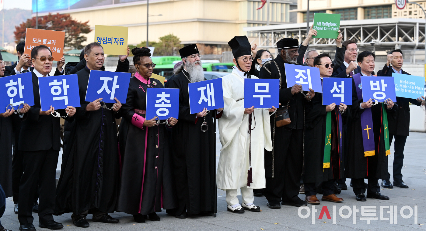 세계 종교 지도자들 50여 명이 13일 오후 광화문 세종대왕동상 앞에서 종교적 가치, 종교적 양심 지지 및 한학자 총재 석방 염원하는 기자회견을 개최했다.