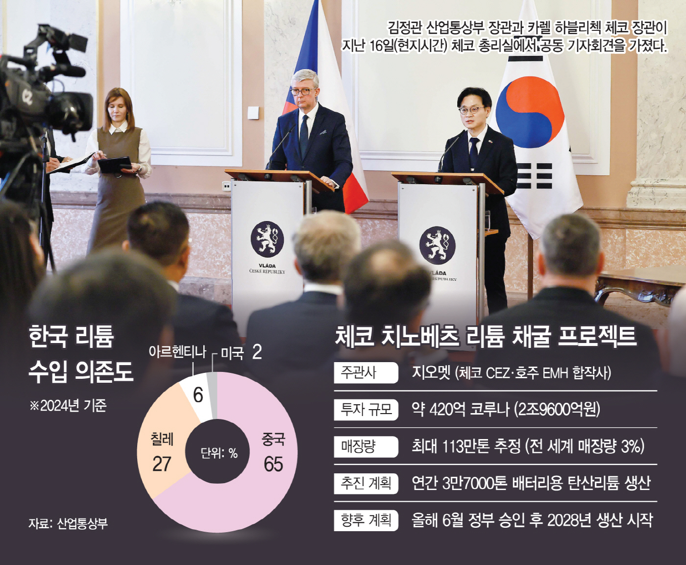 다만 체코 측이 밝힌 리튬 광산 개발 계획은 양 정부가 주도하는 사업이 아닌, 민간기업 차원에서 진행되고 있는 프로젝트라는 게 정부의 입장이다. 산업부 관계자는 "김 장관의 체코 방문에서 양국의 다양한 경제 협력 논의가 있었다"며 "장관 간의 면담에서 관련 제안이 있었지만, 정책적 지원 사항은 논의되지 않았다"고 밝혔다.