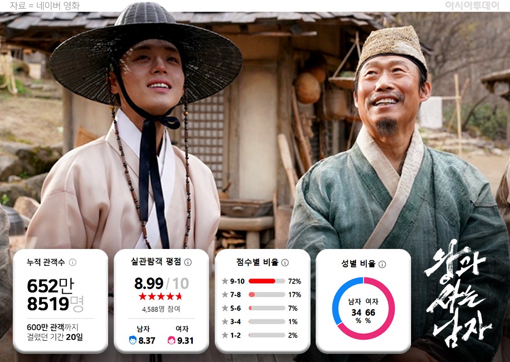 26일 영화관입장권통합전산망에 따르면 '왕사남'은 전날 하루동안 30만9574명을 불러모아 일일 박스오피스 정상을 15일째 독주하며, 지난 4일 개봉 이후 누적 관객수를 652만8519명으로 끌어올렸다. 앞서 600만 관객까지 이르는데 걸렸던 기간은 20일로, 투자·배급을 맡은 쇼박스는 "1000만 관객이 관람했던 2012년작 '광해, 왕이 된 남자'와 같고, 2006년작 '왕의 남자'보다 9일 빠른 관객몰이 속도"라며 '왕사남'의 1000만 관객 동원에 군불을 지폈다.