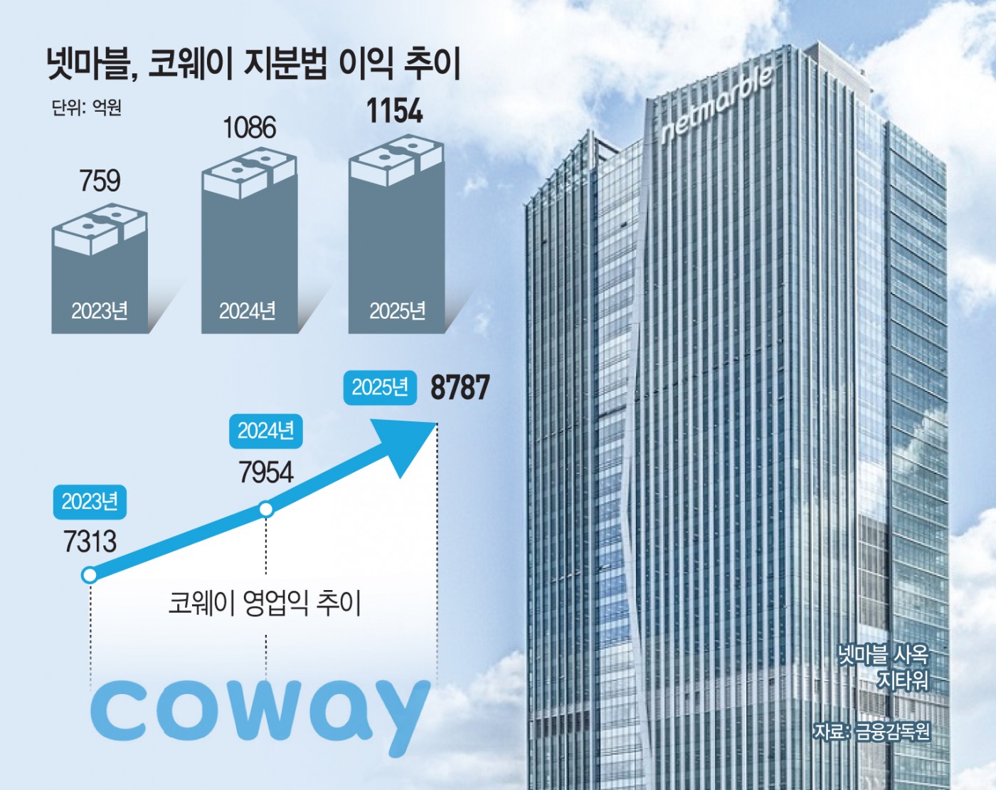 7일 금융감독원 전자공시시스템에 따르면 넷마블은 최근 3년간 코웨이로부터 약 3000억원 규모의 지분법 이익과 1098억원의 배당 수익을 확보했다. 연간 기준으로는 코웨이 관련 이익이 매년 1000억원 안팎으로 발생하는 셈이다. 지난해 코웨이에서 발생한 지분법 이익은 1154억원으로 같은 기간 넷마블 당기순이익 2451억원의 약 47%에 해당한다. 배당은 순이익이 아닌 현금 유입 항목으로, 지분법 이익과는 별도로 재무구조 안정성에 기여한다.