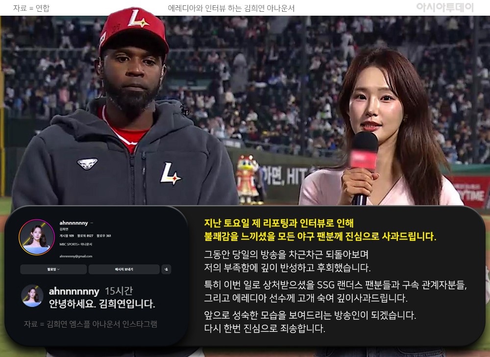 김 아나운서는 지난 9일 자신의 인스타그램을 통해 "지난 토요일 제 리포팅과 인터뷰로 인해 불쾌감을 느끼셨을 모든 야구 팬분께 진심으로 사과드린다"며 "방송을 되돌아보며 부족함을 깊이 반성했다"고 밝혔다. 이어 SSG 랜더스 팬들, 구단 관계자, 외국인 선수 기예르모 에레디아를 직접 언급하며 고개를 숙였다.