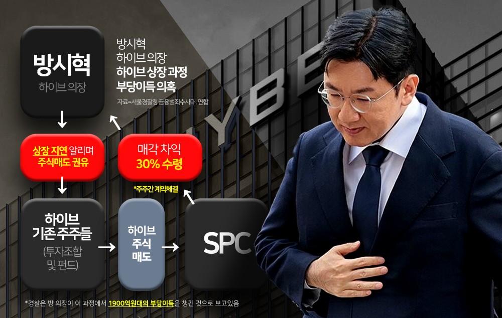 방 의장은 2019년 하이브 상장을 앞두고 기존 주주와 투자자들로부터 주식을 매수하면서, 회사의 상장 준비가 진행 중이었음에도 상장이 지연되거나 추진 계획이 없는 것처럼 속인 혐의를 받고 있다. 경찰은 방 의장이 이 과정에서 1900억원대의 부당이득을 챙긴 것으로 보고 있다.