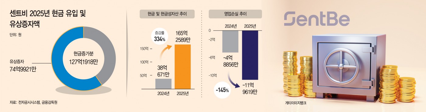 센트비는 유상증자와 관계사 미수금 회수, 고객 예수금 증가에 따른 예치금 확대로 유동비율을 32% 포인트 올렸다. 센트비의 2025년 말 유동자산은 240억8786만원, 유동부채는 114억6263만원으로 유동비율은 약 210%다. 전년 말 유동자산 135억7439만원, 유동부채 76억3146만원을 기준으로 계산한 유동비율 약 178%보다 개선됐다. 현금및현금성자산은 165억2589만원으로 전년 말 38억671만원에서 급증했다. 숫자상으로는 재무안정성이 개선된 것처럼 보이지만 영업활동을 통한 현금창출력 개선이 아닌 외부 조달과 고객 정산성 자금 증가, 예치금 확대가 반영된 결과로 해석된다.